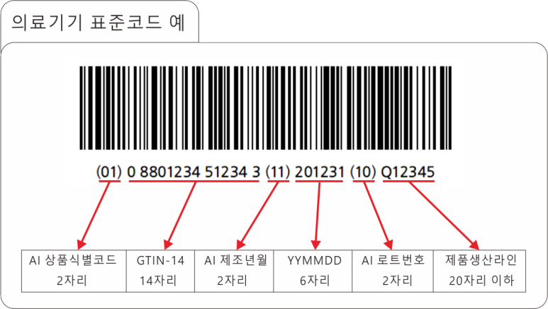 이 내용을 풀어보면 상품 식별코드는 08801234512343 이고 제조년월이 2020년 12월31일, 로트번호 Q12345 인 제품입니다.
