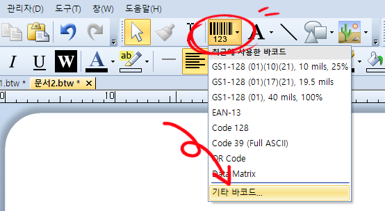 바텐더 신규 문서를 생성한 후 바코드 -> 기타 바코드를 클릭합니다.