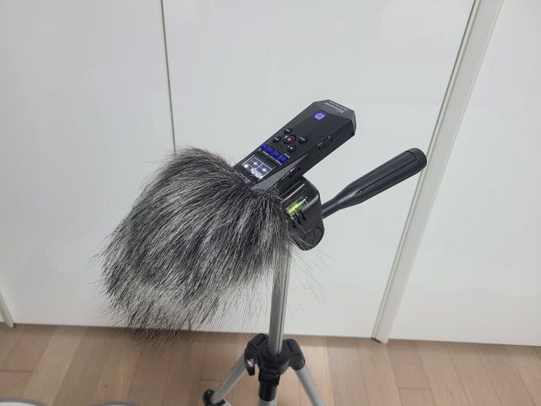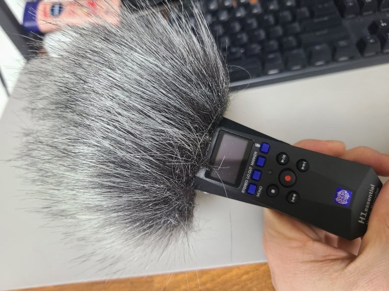 사용하지 않는 샷건 마이크용 윈드스크린을 H1e 마이크 부분에 맞게 잘라서 끼워 봤습니다.