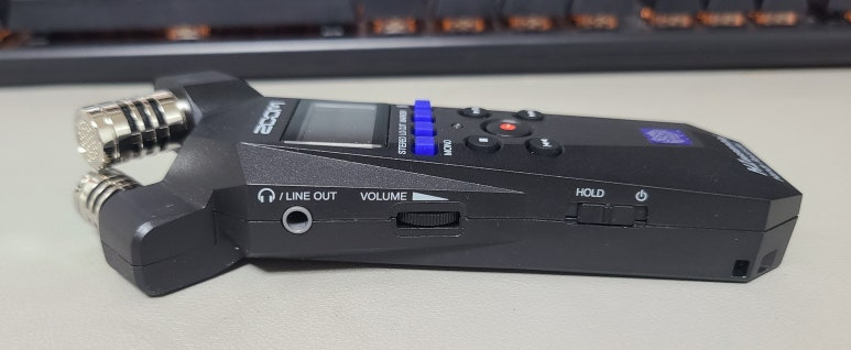 왼쪽 측면에는 헤드폰 연결, 라인 아웃 단자와 볼륨 조절노브가 있고 전원 스위치가 있습니다. 전원스위치를 위로 올리면 hold 상태가 됩니다.