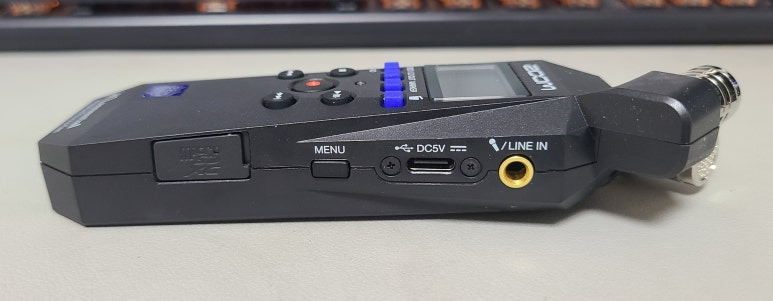 오른쪽 측면에는 외부 마이크 입력, 라인 인 단자와 컴퓨터와 연결하거나 외부 전원 공급을 위한 USB C 단자와 메뉴버튼, 마이크로SD 카드 슬롯이 있습니다.