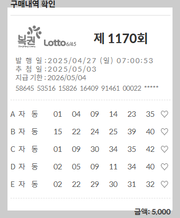 인터넷 동행복권 홈페이지에서 자동번호로 구입했습니다.