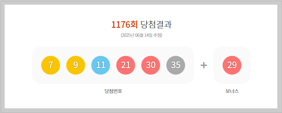 로또 1176회 1등 당첨번호는7,9,11,21,30,35 보너스 29 입니다.