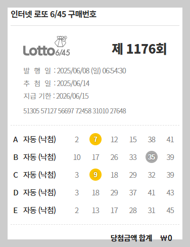 인터넷 동행복권 홈페이지에서 자동번호로 구입했습니다.
