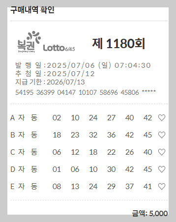 2025년 7월 12일 추첨하는 로또 1180회 입니다.