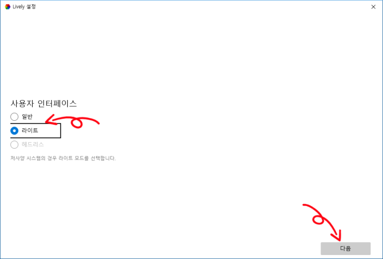 사용자 인터페이스 설정부분에서는 컴퓨터 사양이 낮은 경우 일반을 선택하시면 됩니다.