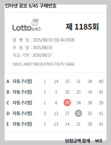 인터넷 동행복권 홈페이지에서 자동번호로 구입했습니다.