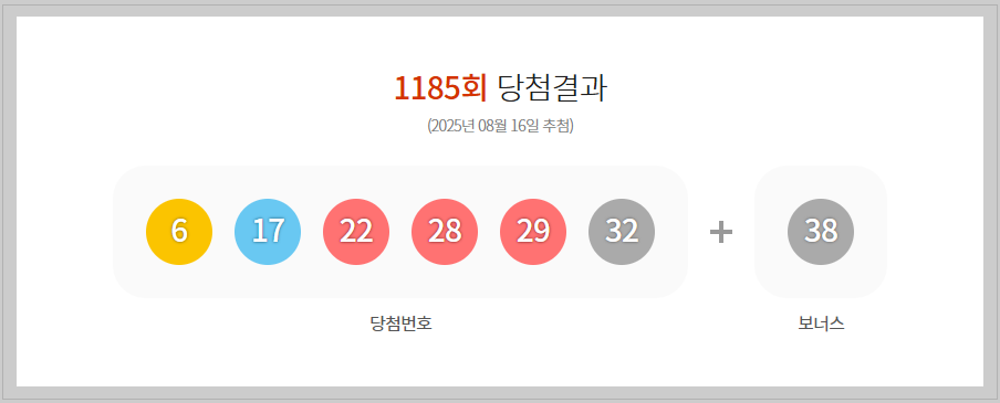 로또 1185회 1등 당첨번호는 6,17,22,28,29,32 보너스 38 입니다.
