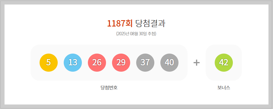로또 1187회 1등 당첨번호는 5,13,26,29,37,40 보너스 42 입니다.
