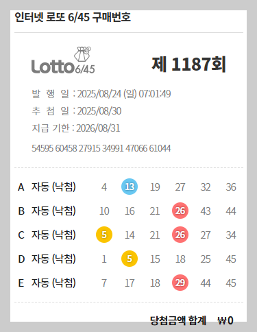 지난주 구입했던 1187회 당첨 결과를 공개합니다