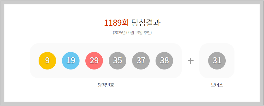 로또 1189회 1등 당첨번호는 9,19,29,35,37,38 보너스 31 입니다.