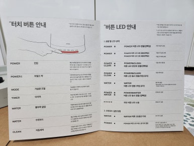 컨트롤부에는 POWER (전원), MODE(가습량조절), TIMER(타이머), WATER(물부족알림), CLEAN(자동세척) LED 가 있고 글자 바로 아래를 터치하면 됩니다.