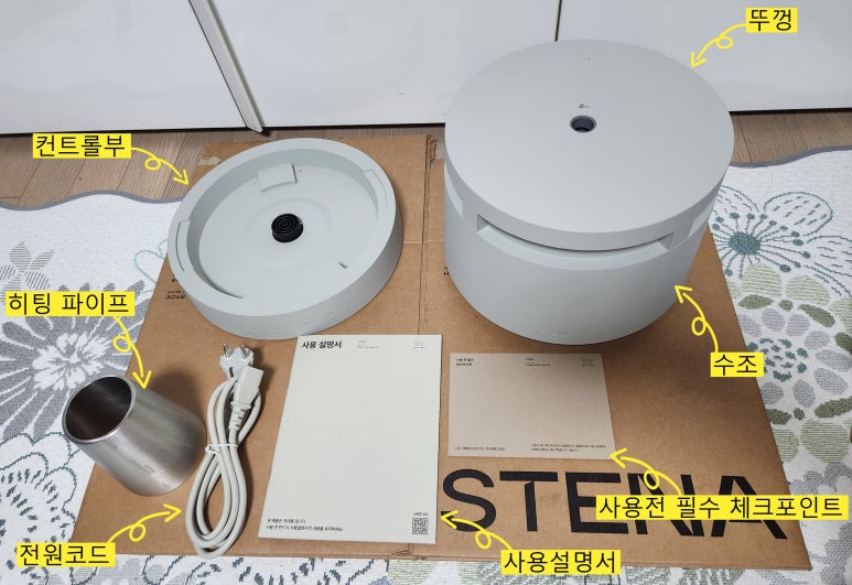박스 안에 컨트롤부, 본체(수조, 뚜껑), 히팅파이프, 전원케이블, 설명서가 들어 있습니다.