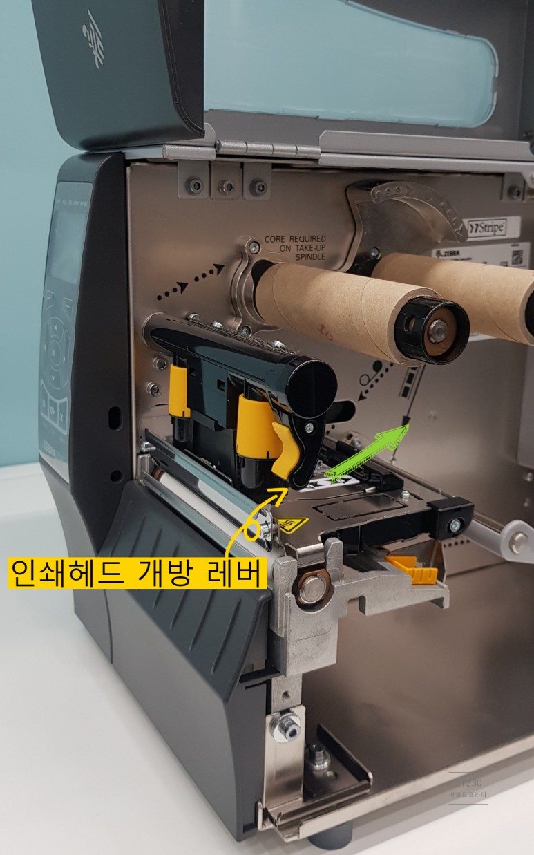 인쇄헤드 개방 레버를 밀면 헤드 어셈블리가 위로 올라가며 열리는 구조 입니다.