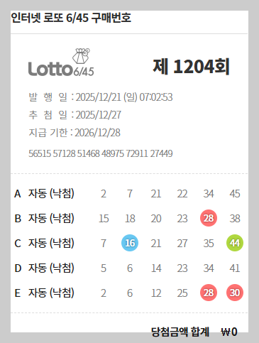 지난주 구입했던 1204회 당첨 결과를 공개합니다