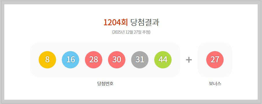 로또 1204회 1등 당첨번호는 8,16,28,30,31,44 보너스 27 입니다.
