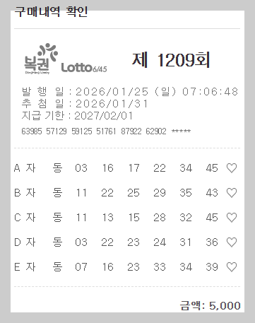 2026년 1월 31일 추첨하는 로또 1209회 입니다.
