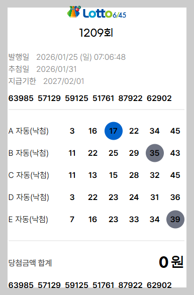 지난주 구입한 1209회 1등 당첨 번호를 확인해 보겠습니다.