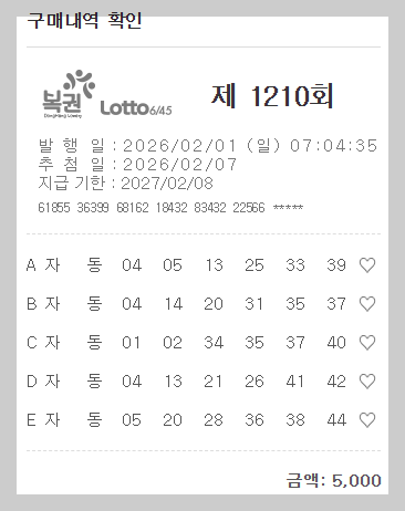 인터넷 동행복권 홈페이지에서 자동번호로 구입했습니다