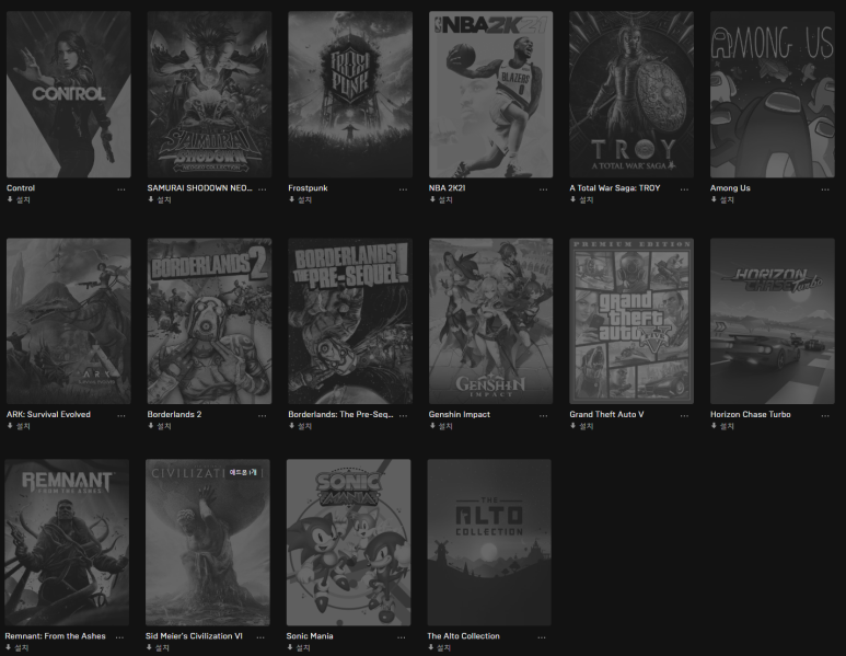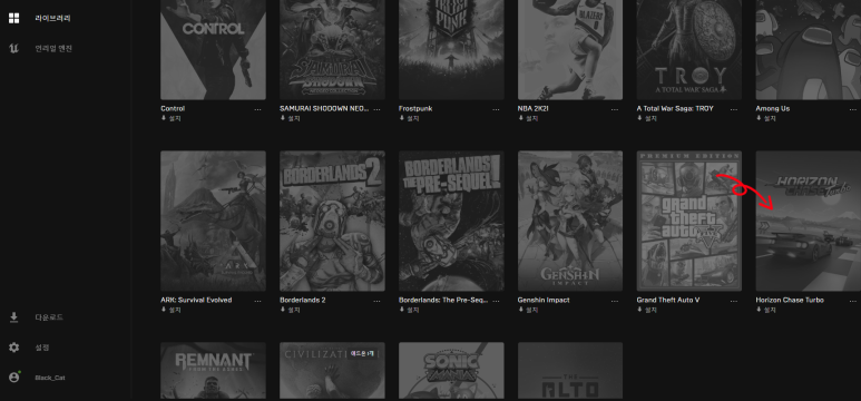 "라이브러리에 있음" 을 클릭하면 라이브러리 화면으로 이동하고 구입한 게임이 화면에 흑백으로 표시됩니다.