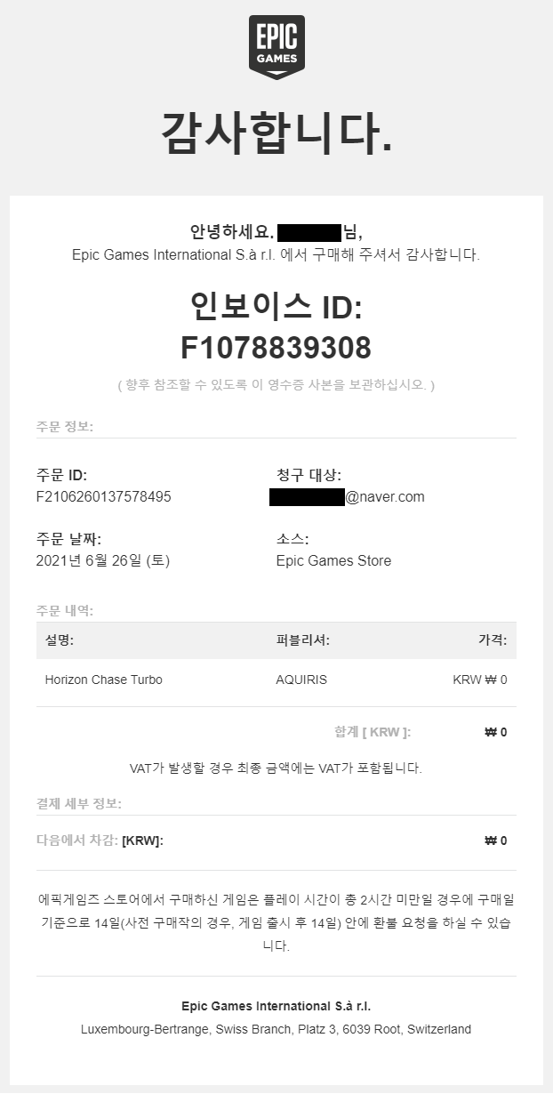 이메일로 주문한 내역이 도착합니다. 물론 구입 금액은 0원으로 찍힙니다.