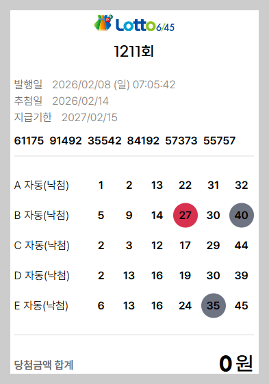 지난주 구입한 1211회 1등 당첨 번호를 확인해 보겠습니다.