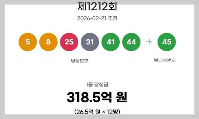 로또 1212회 1등 당첨번호는 5,8,25,31,41,44 보너스 45 입니다.
