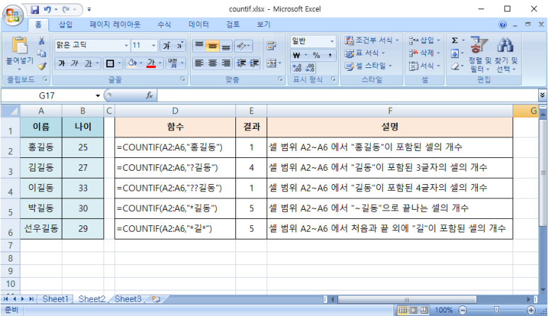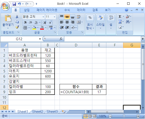 이 그림은 A1:B9 영역에 비어있지 않는 셀 개수가 17개 있다는 결과를 보여줍니다.