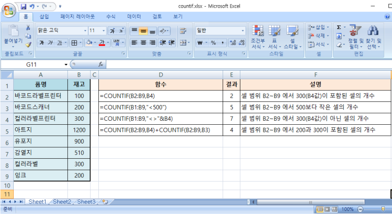 지정한 범위 안에서 조건에 맞는 셀의 개수를 세어줍니다.