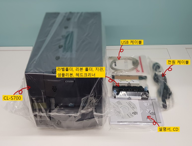 박스 안에는 CL-S700, USB케이블, 전원케이블, 설명서, CD, 라벨 홀더,