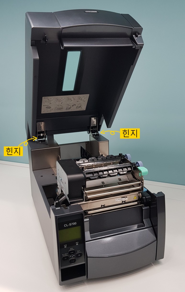 덮개 안쪽에는 라벨, 리본 장착 방법이 그림으로 설명 되어 있습니다.