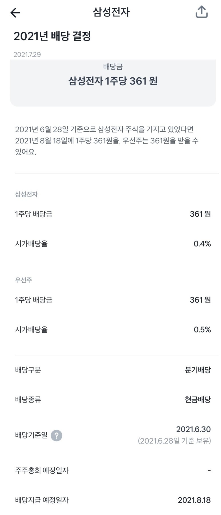 2분기 배당 금액은 삼성전자 1주당 361원이 배당 금액으로 결정 되었습니다.