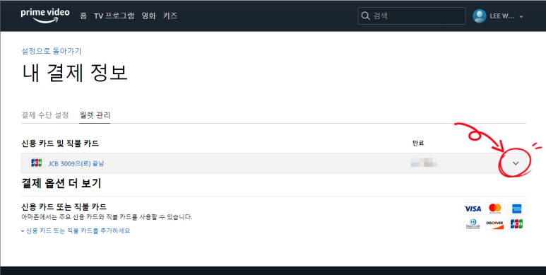 이제 등록한 카드를 삭제하기 위해 월렛 관리를 클릭합니다.