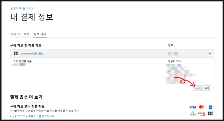 등록된 카드를 삭제하기 위해 삭제 버튼을 클릭합니다.