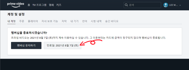 멤버십 종료 확인 페이지가 나옵니다. 오른쪽에 있는 만료일 표시된 버튼을 클릭합니다.