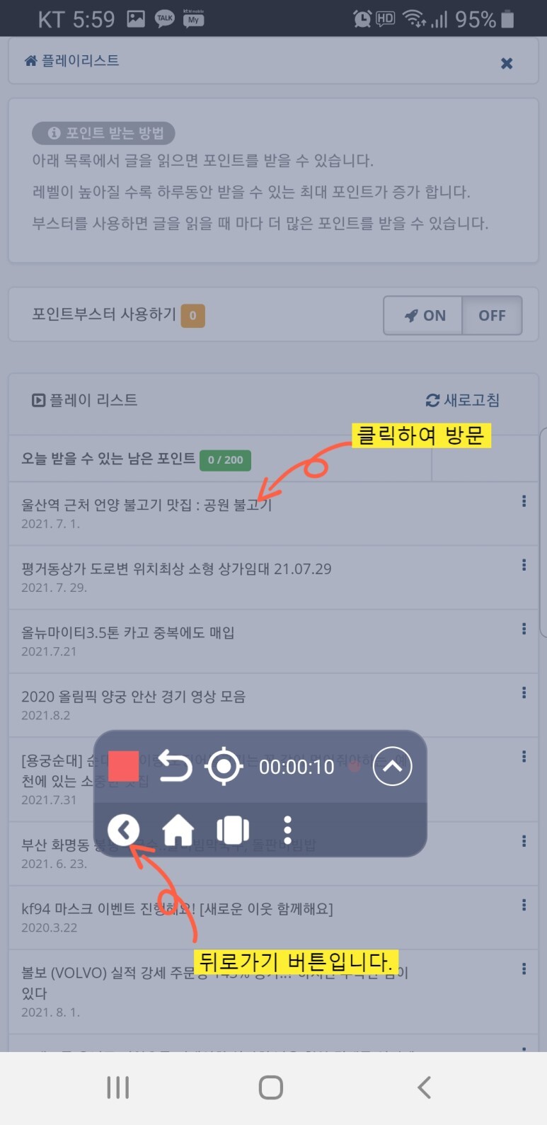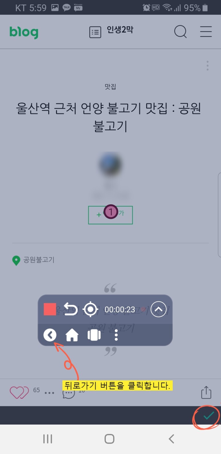 블로그 방문 후 뒤로가기 버튼을 클릭해야 하는데 하위메뉴에 뒤로가기 버튼이 있습니다.