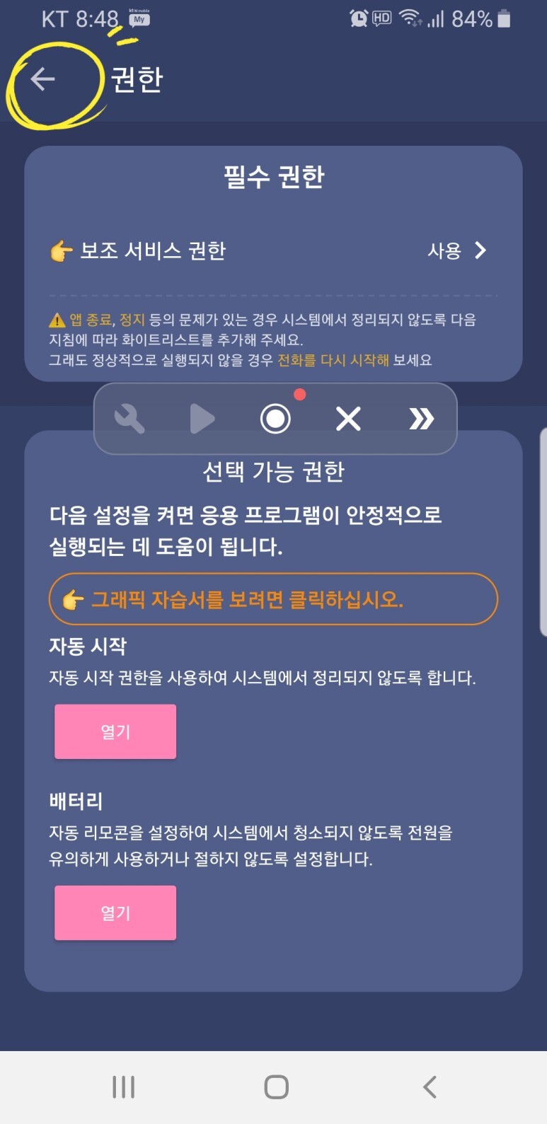 하위 메뉴에 뒤로가기 버튼이 있습니다.