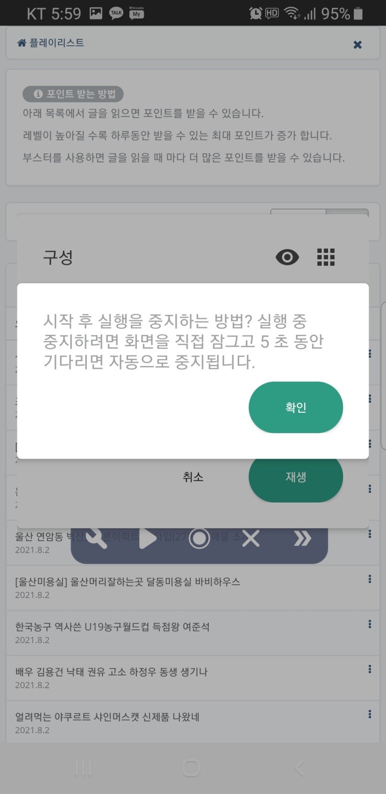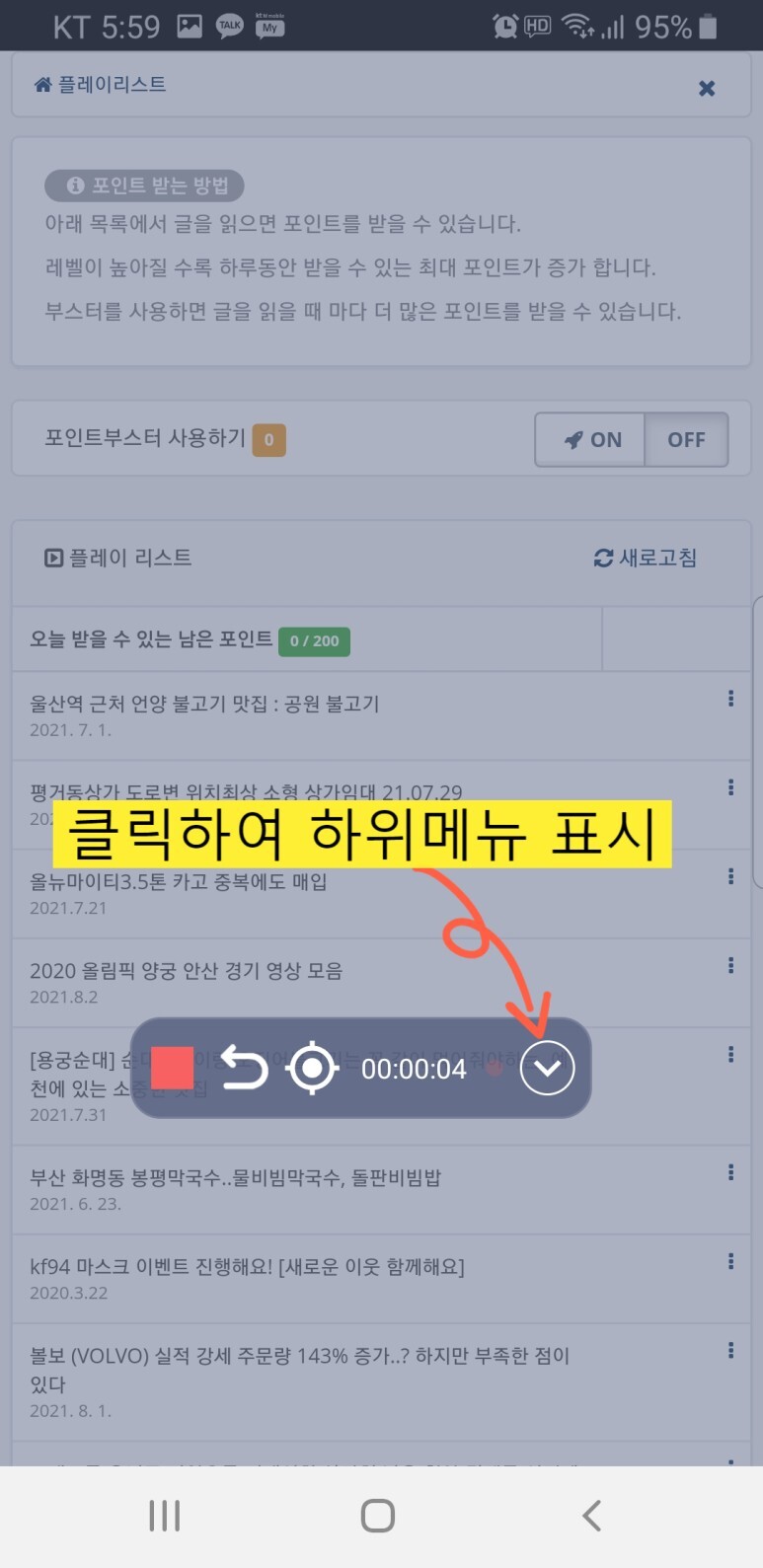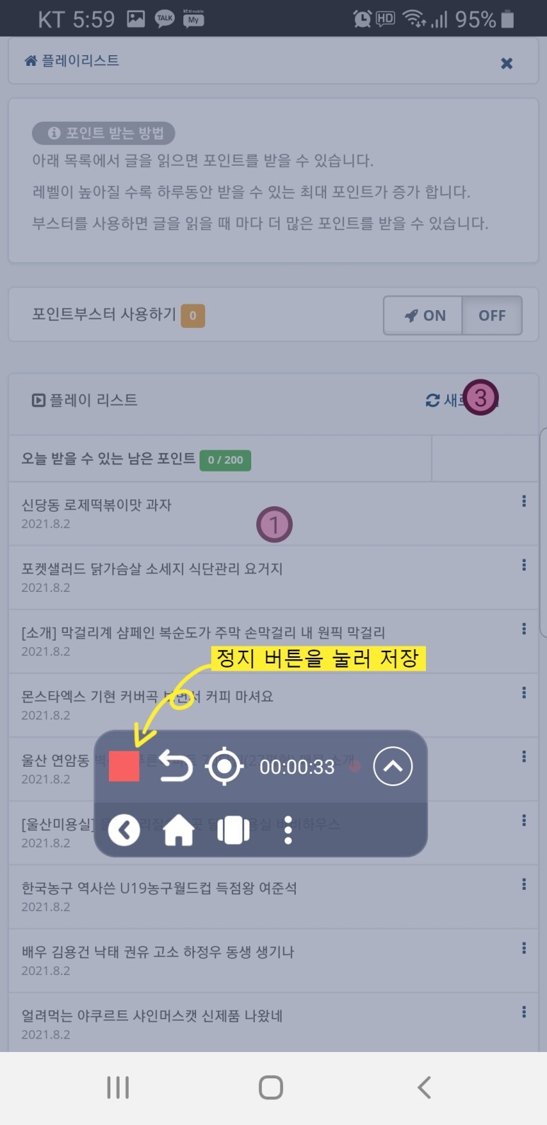 기록 버튼을 누르면 종료버튼을 눌러 기록작업을 종료하라는 안내가 나옵니다.