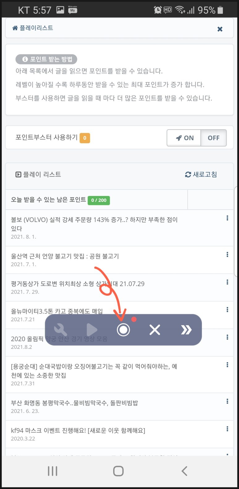기록이 시작되면 시간이 카운트 되며 빨간색 정지 버튼이 생긴것이 보입니다.