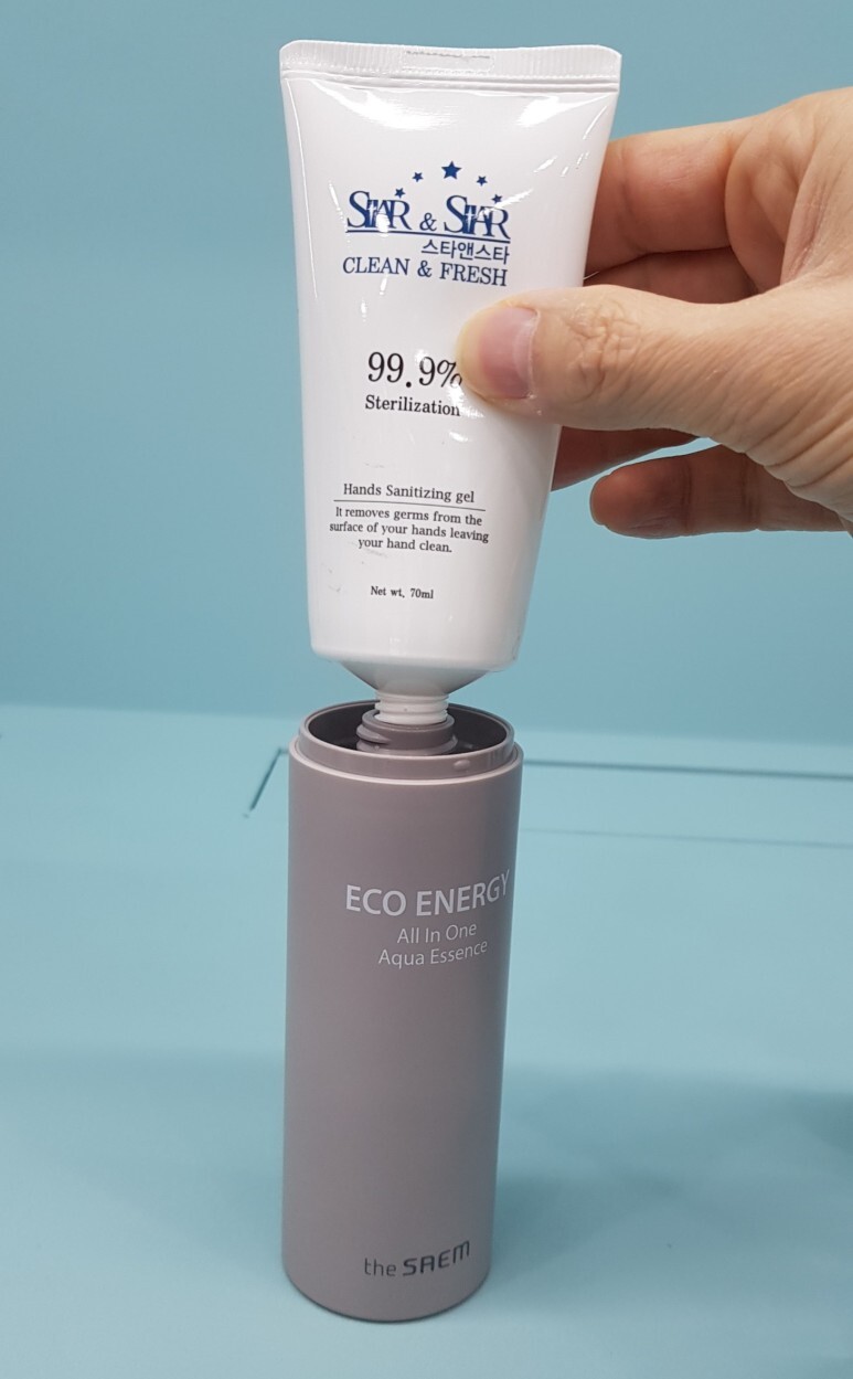 튜브에 있는 손소독제를 용기에 옮겨 담았습니다.